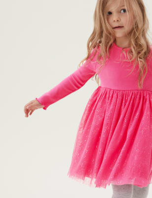 Cotton tulle dress. Lace detailing at hem. Pink dress for girls by Patachou made in silky cotton jacquard with a leaf pattern. Earn 4 cash back.